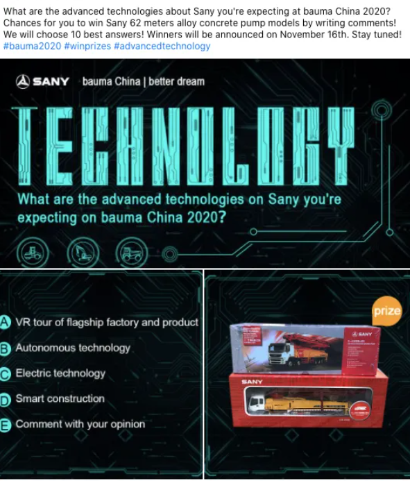 在2020年的Bauma CHINA期間,三一集團曾經以#Bauma2020為主話題,積極地在社交媒體上進行宣傳和營銷。他們共發布了將近20條與該話題相關的文章,占據了整個11月份發文總數將近7成。可以說,在那個月份,三一集團的Facebook主頁幾乎都在圍繞這一話題展開各種營銷活動。