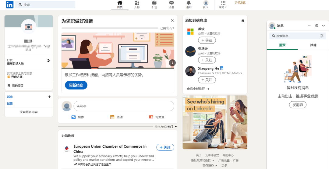 這時候就會跳轉(zhuǎn)到自己的Linkedin主頁面,這只是個開始,要想好好維護(hù)好自己的Linkedin賬號,就要進(jìn)行以下的操作;
