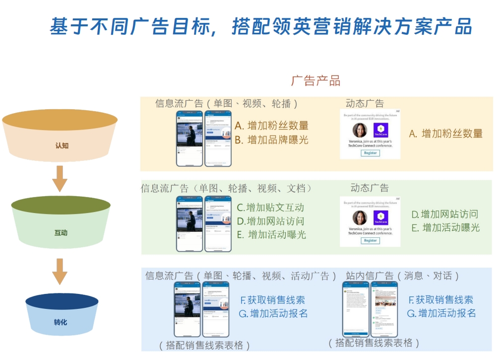 LinkedIn 匯聚了超過10 億活躍職場人士,是全球最大的專業社交網絡,廣告主可以按照地域、公司、行業、職位、學歷、興趣等多種條件定向投放,精準觸達廣告主的目標客戶。